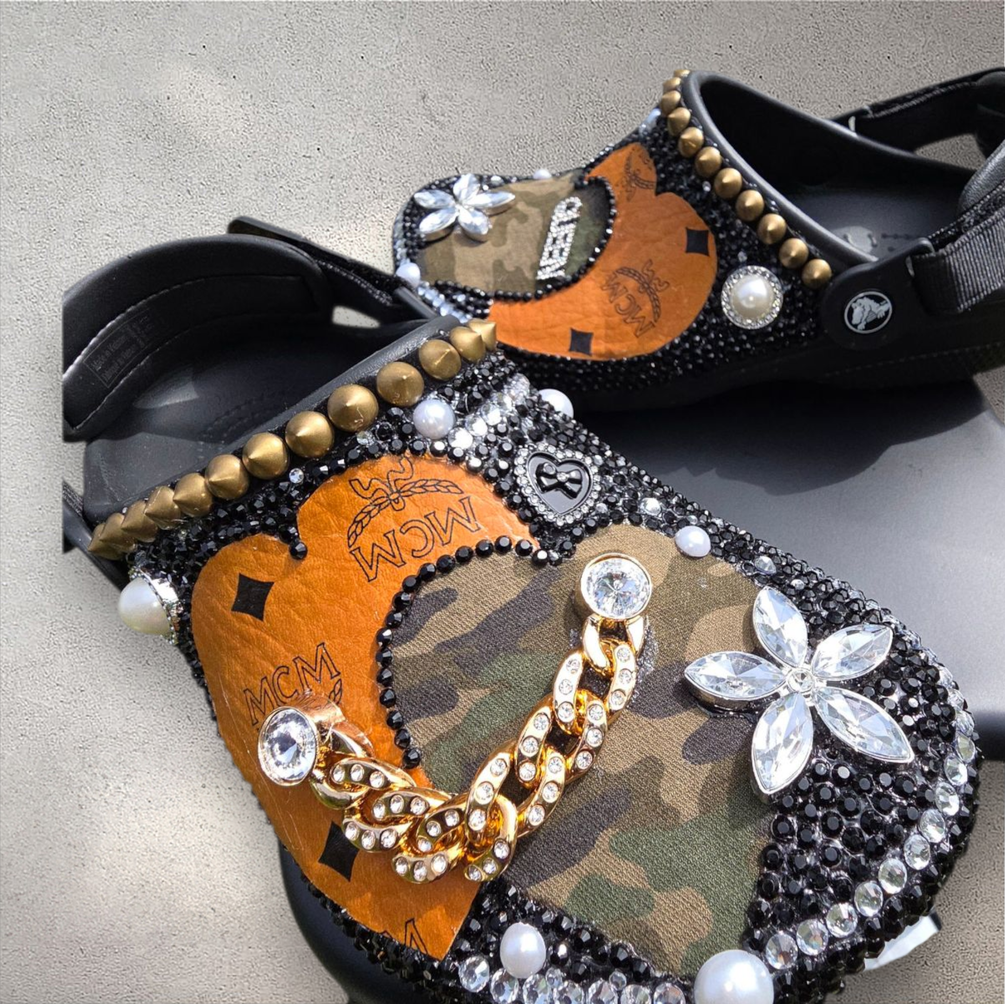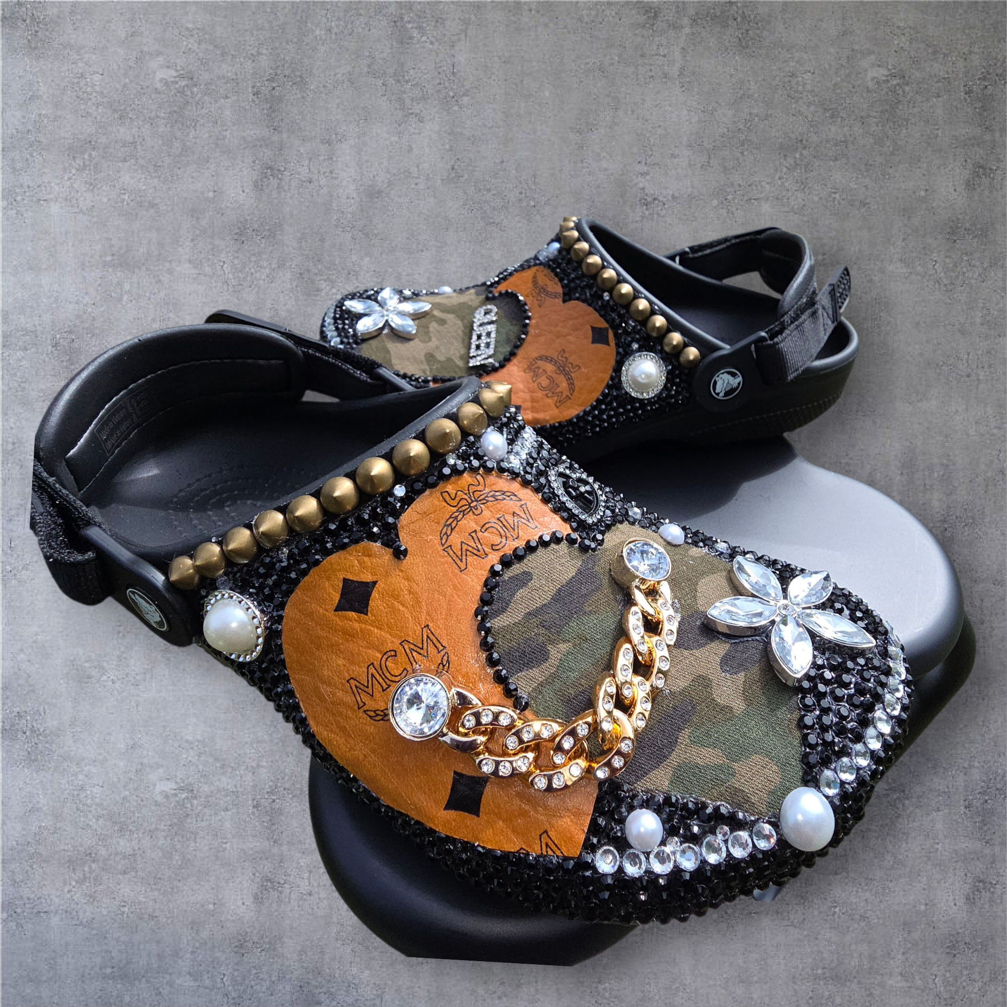 These Crocs are not for blending in—they’re for standing out. Glamouflage brings camo to the catwalk with rhinestones, pearls, gold chains, and MCM heart patches that scream luxury in every step. Designed for the ladies who love a little sparkle with their stomp, each pair is hand-embellished to deliver sass, class, and certified hood royalty.